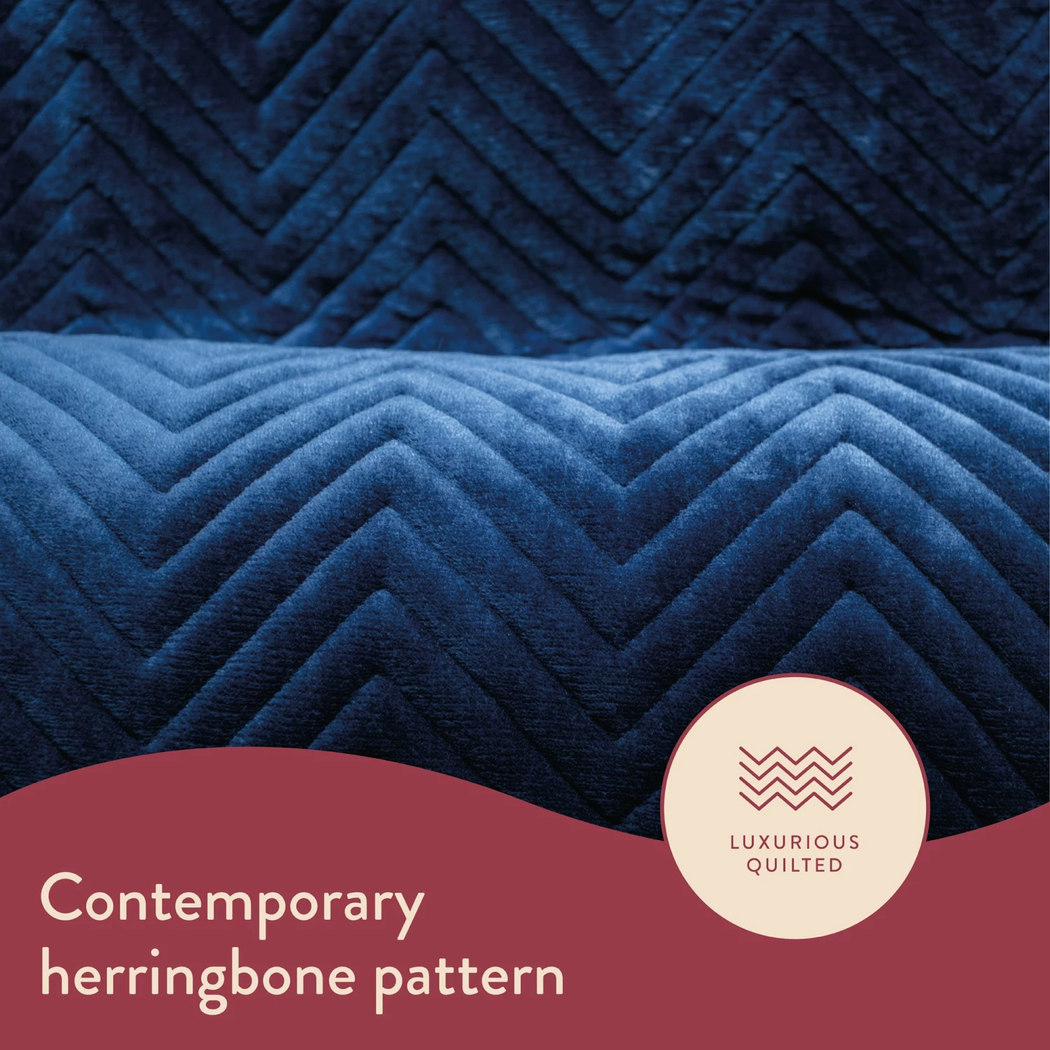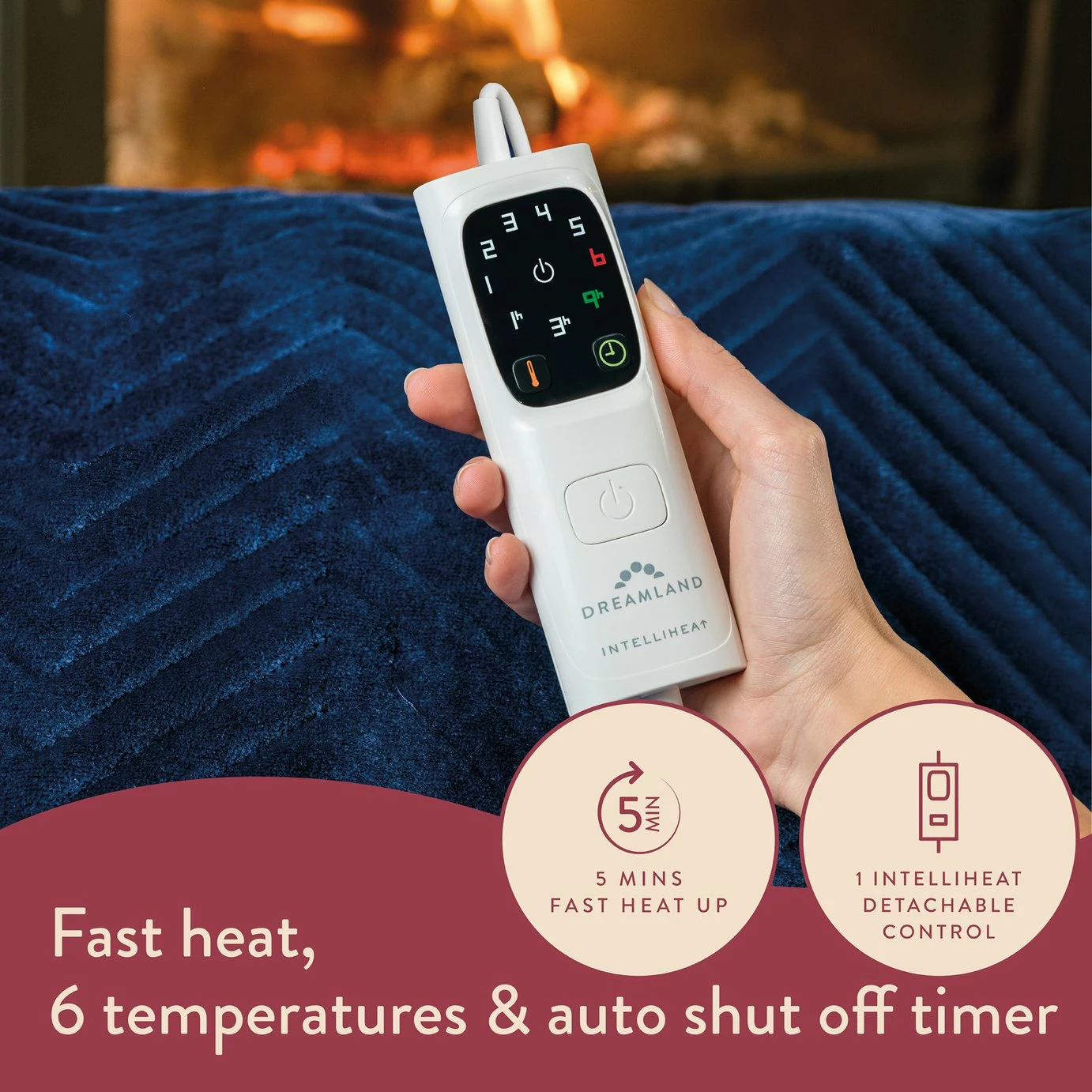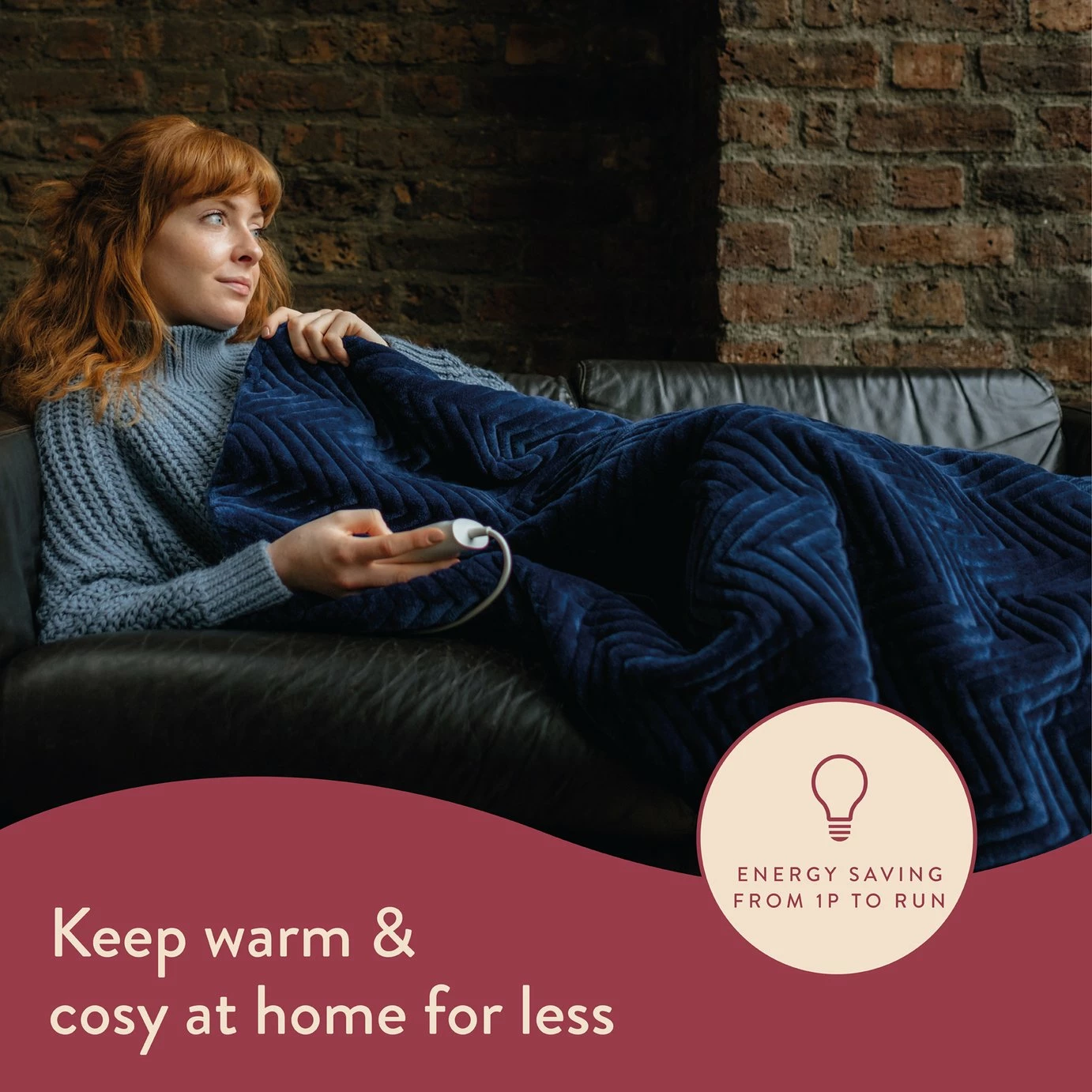 Luxurious quilted velvet warming throw in Navy Blue, featuring a contemporary herringbone pattern perfect for solo snuggling or shared cocooning. And when you're not requiring the warmth and wellbeing benefits, it cleverly doubles up as a lavish living room accessory. 5 minute fast heat up, 6 temperature settings, auto shut off timer. It's machine washable and tumble dryer safe; simply detach the digital control. Comes with a reusable storage bag and 2 year guarantee. Energy saving, costing from only 1p to run.