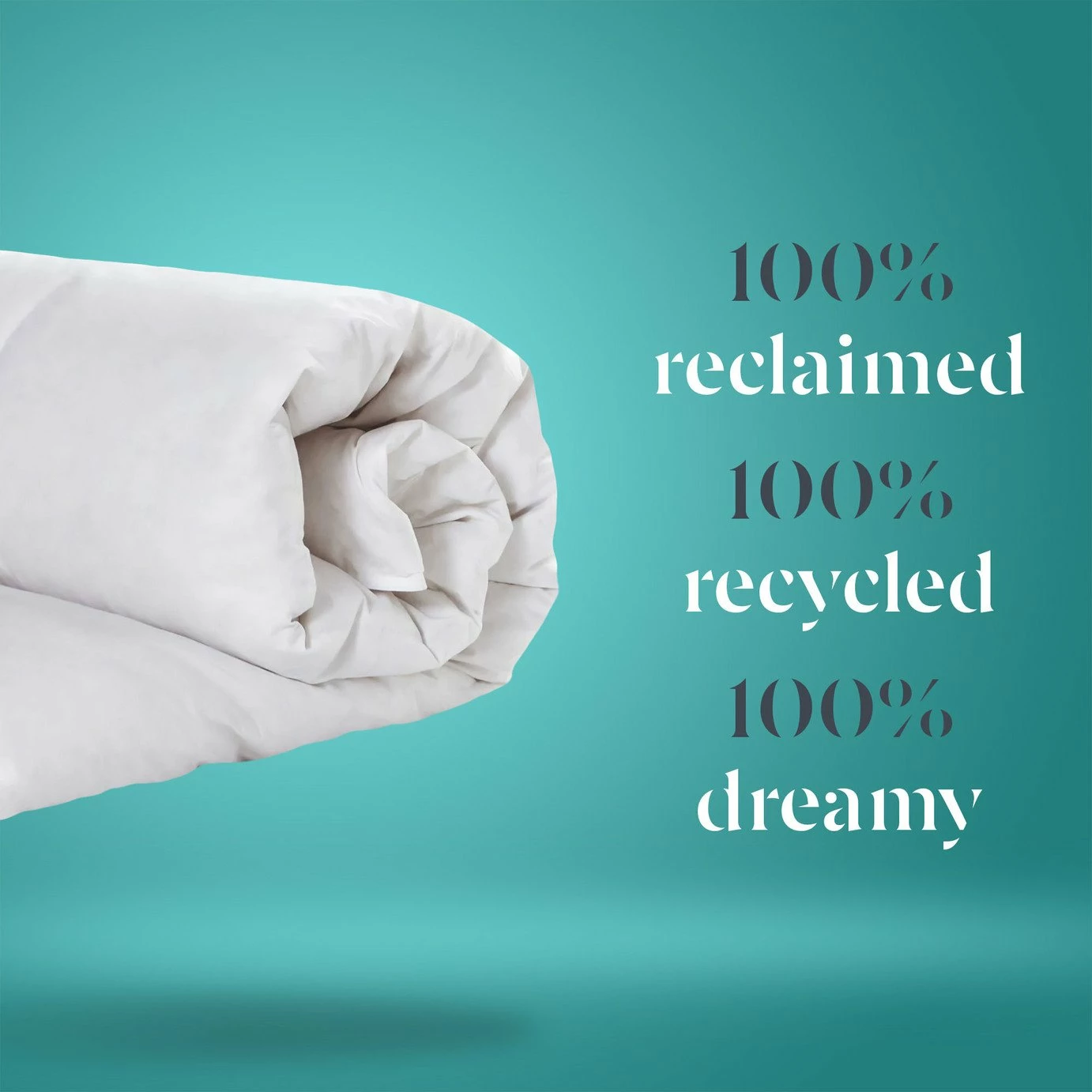 This EarthKind Luxury Feather & Down 10.5 Tog Duvet is 100% recycled and 100% dreamy. Made in Britain, pre-loved pillows and duvets containing feather and down fillings are sorted and cleaned, before being sterilized and heat-treated. This filling is then repurposed into a brand new, fresh premium blend of 85% feather and 15% down which is rigorously checked to ensure it meets the highest quality standards. The result is a natural duvet that's soft and luxurious, as well as being kinder to the environment. Suitable for all year round use.