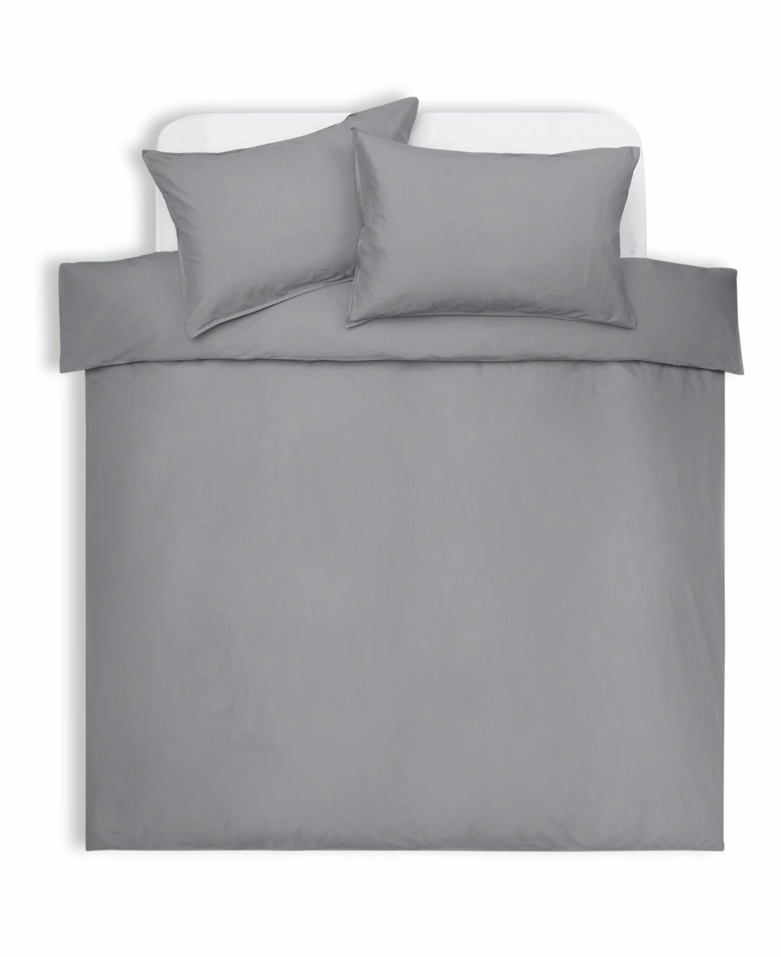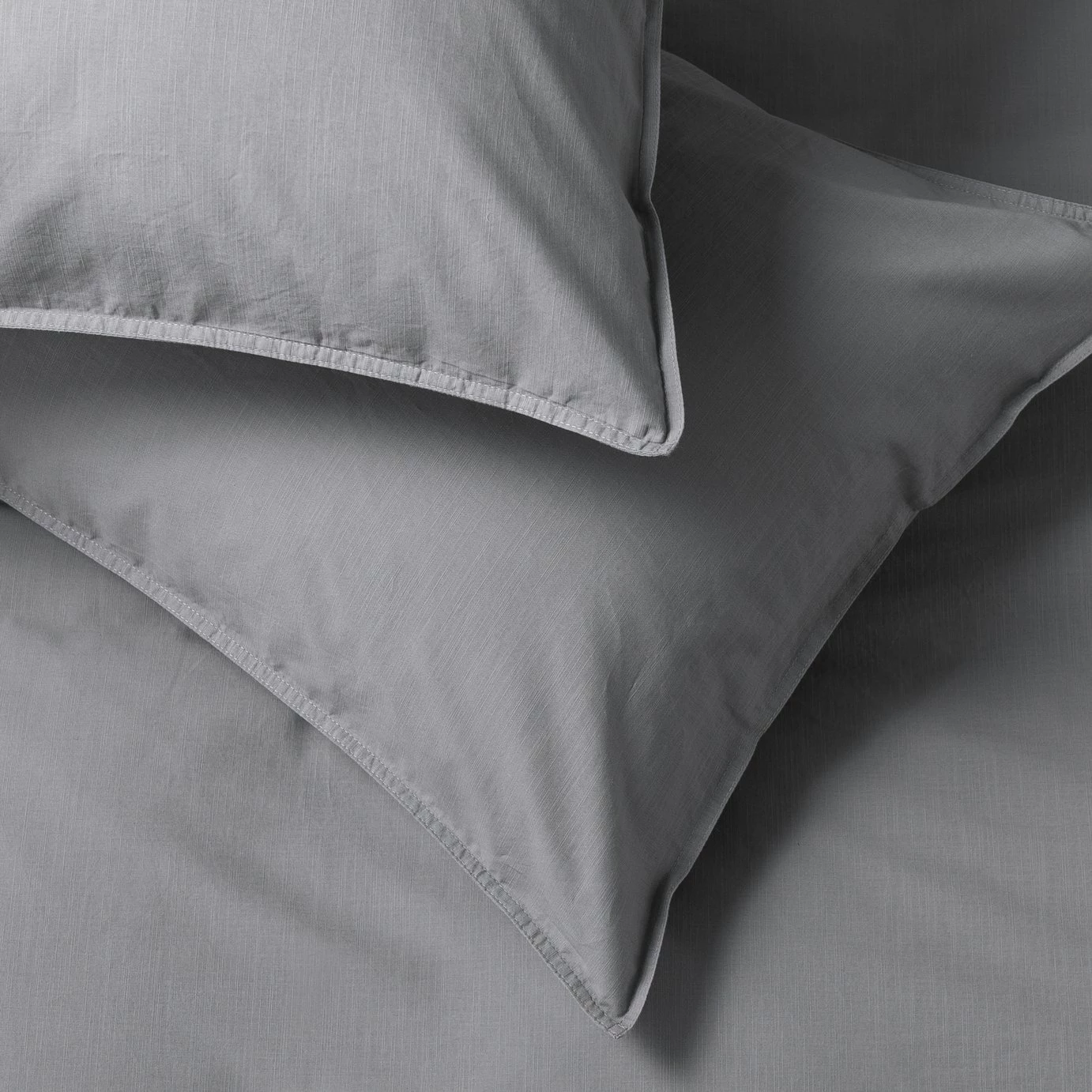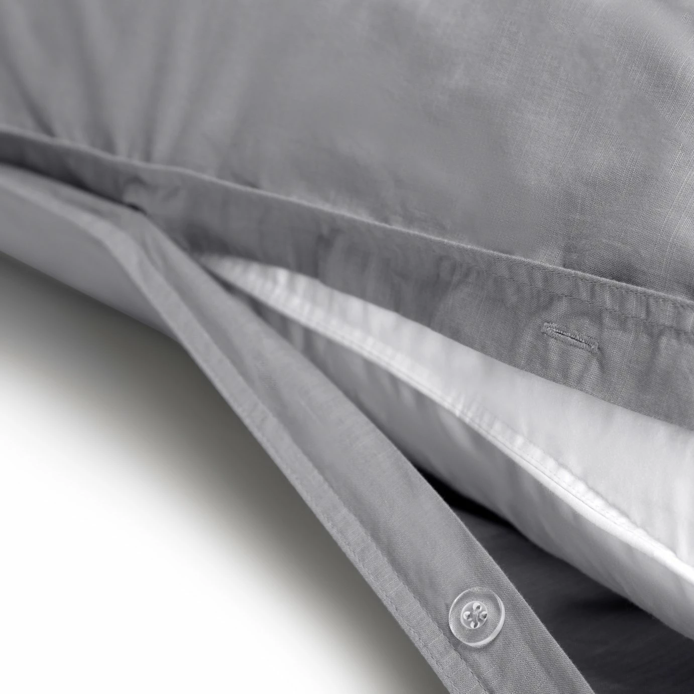 Snuggle into a sea of soothing grey. Jacquard paneling meets a matte linen look in this 100% cotton percale duvet set. The subtle tactile texture gives the slub mix fabric a natural organic feel. An elegantly understated choice.
