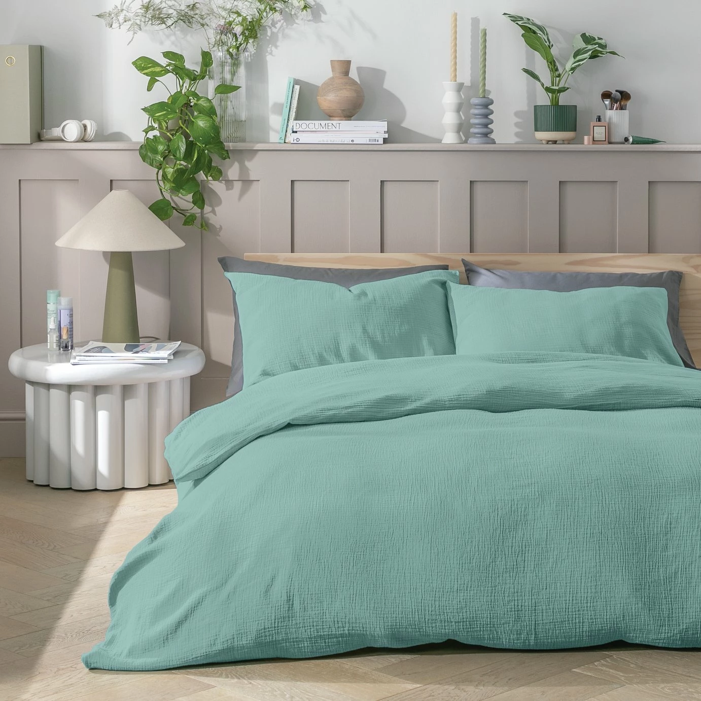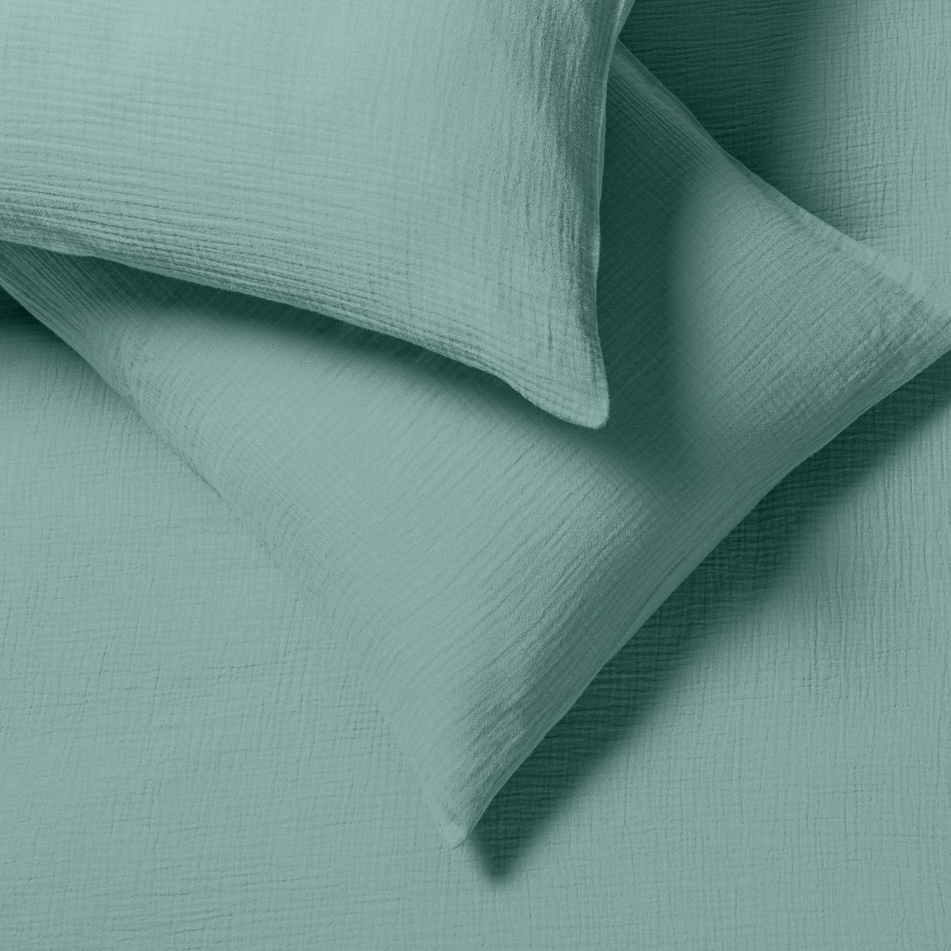 Snuggle into our soft and luxurious green textured duvet set. Made from 100% cotton muslin with a 200 thread count and intricate woven dobby finish. Totally tactile, the subtle tufting adds to its high-end feel. Pure indulgent comfort.