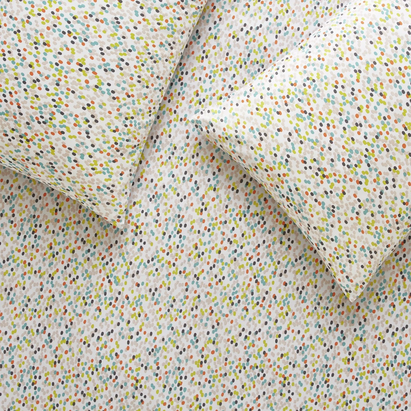 Soft and stylish. Our Angelica bed linens feature whimsical multi-coloured dots on one side and light grey on the reverse. 100% cotton and a 180-thread count makes them cosy to sink down into at the end of the day. Fits in with any decor style you have in your home, from Scandi, to country cottage to modern. This great value single set comes with 2 pillowcases and a duvet cover.