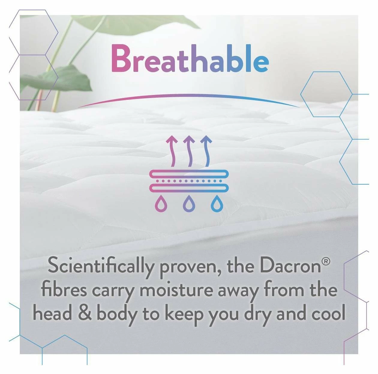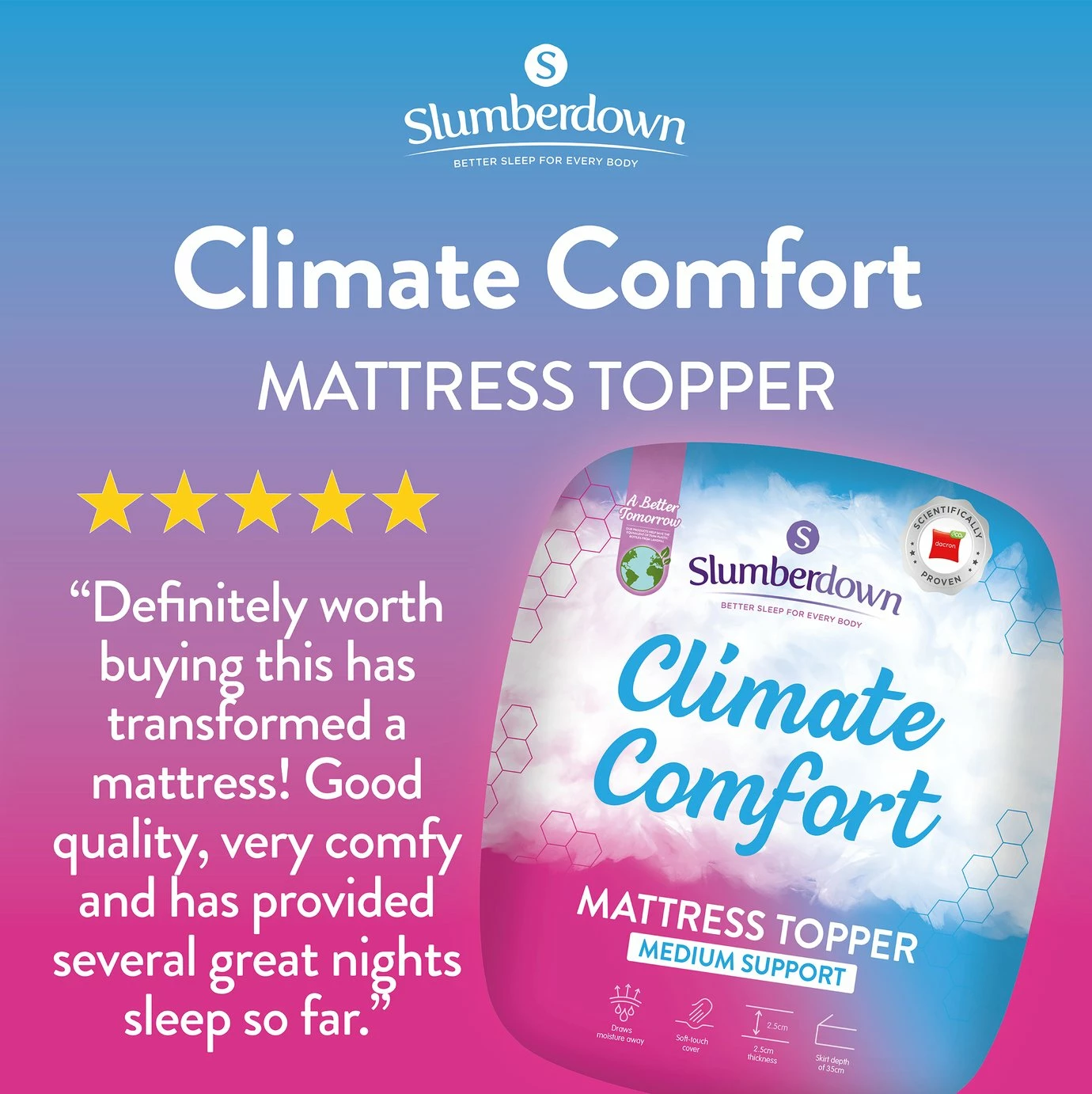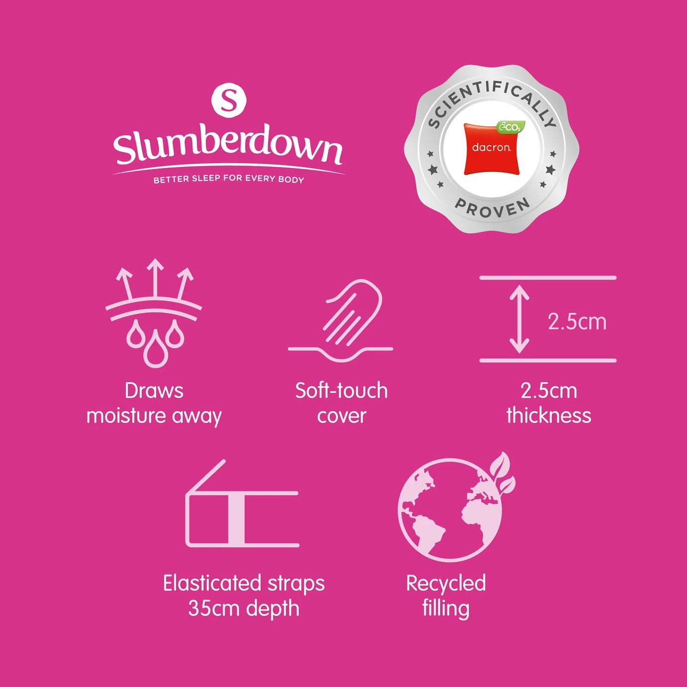 At Slumberdown we believe everybody deserves a better night's sleep. The Slumberdown Climate Comfort Topper has a breathable filling which wicks away moisture resulting in a cool, dry sleep space. The soft touch cover ensures your mattress is protected from sweat and stains. This quilted topper is 2.5cm deep and fits to your bed with a secure skirt, suitable for mattresses up to a depth of 35cm. What's more our products are Easy Care which means they can be machine washed to ensure a clean and fresh sleep space.