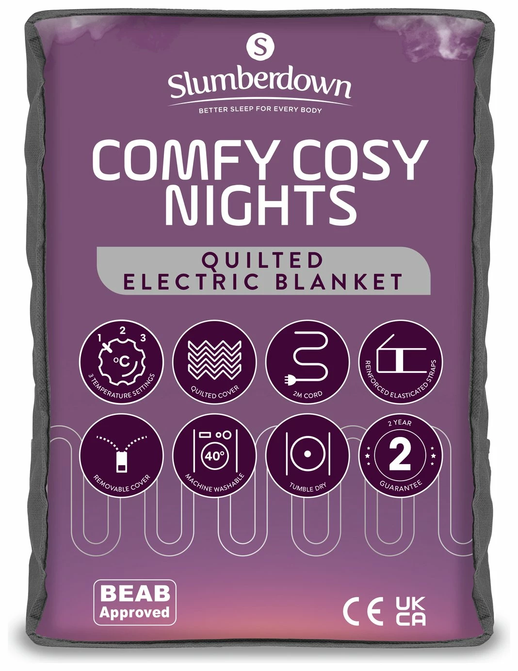 The Slumberdown Comfy Cosy Nights Electric Blanket has a soft touch quilted cover which adds a layer of comfort to your bed. The cover can be fully zipped off when you need to wash it. The reinforced elasticated straps run the full width of your bed ensuring it stays in place night after night. Its easy to use with 3 x heat settings, that can be set for your ideal time period. It has a low energy consumption, with av, run costs of 1p per night. It also comes with a 2 year guarantee, giving you complete peace of mind.