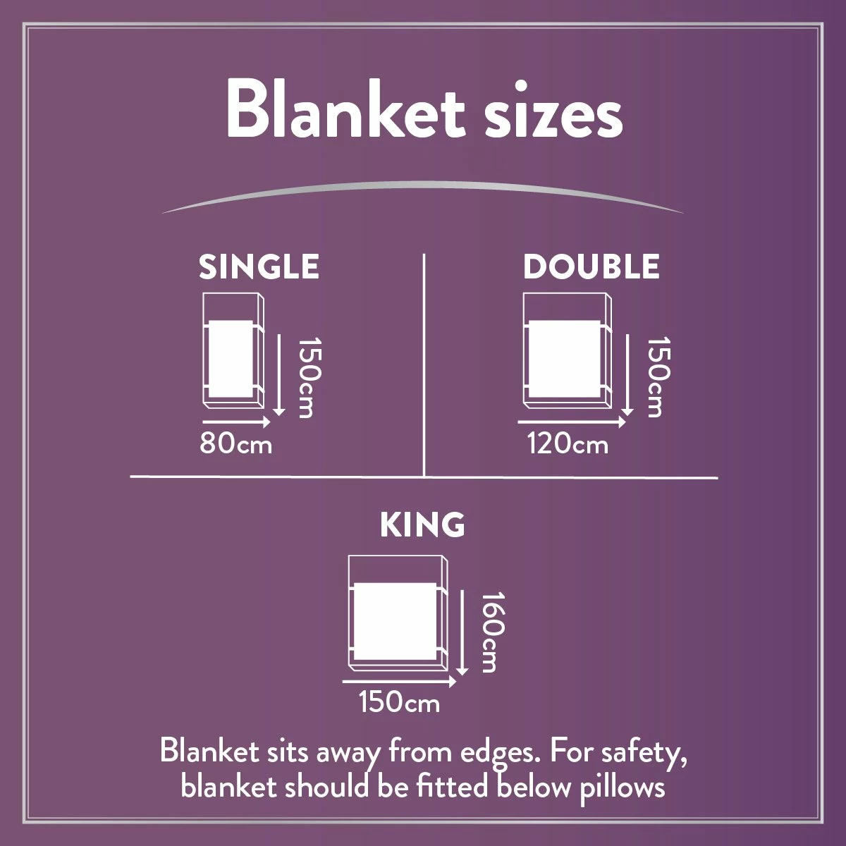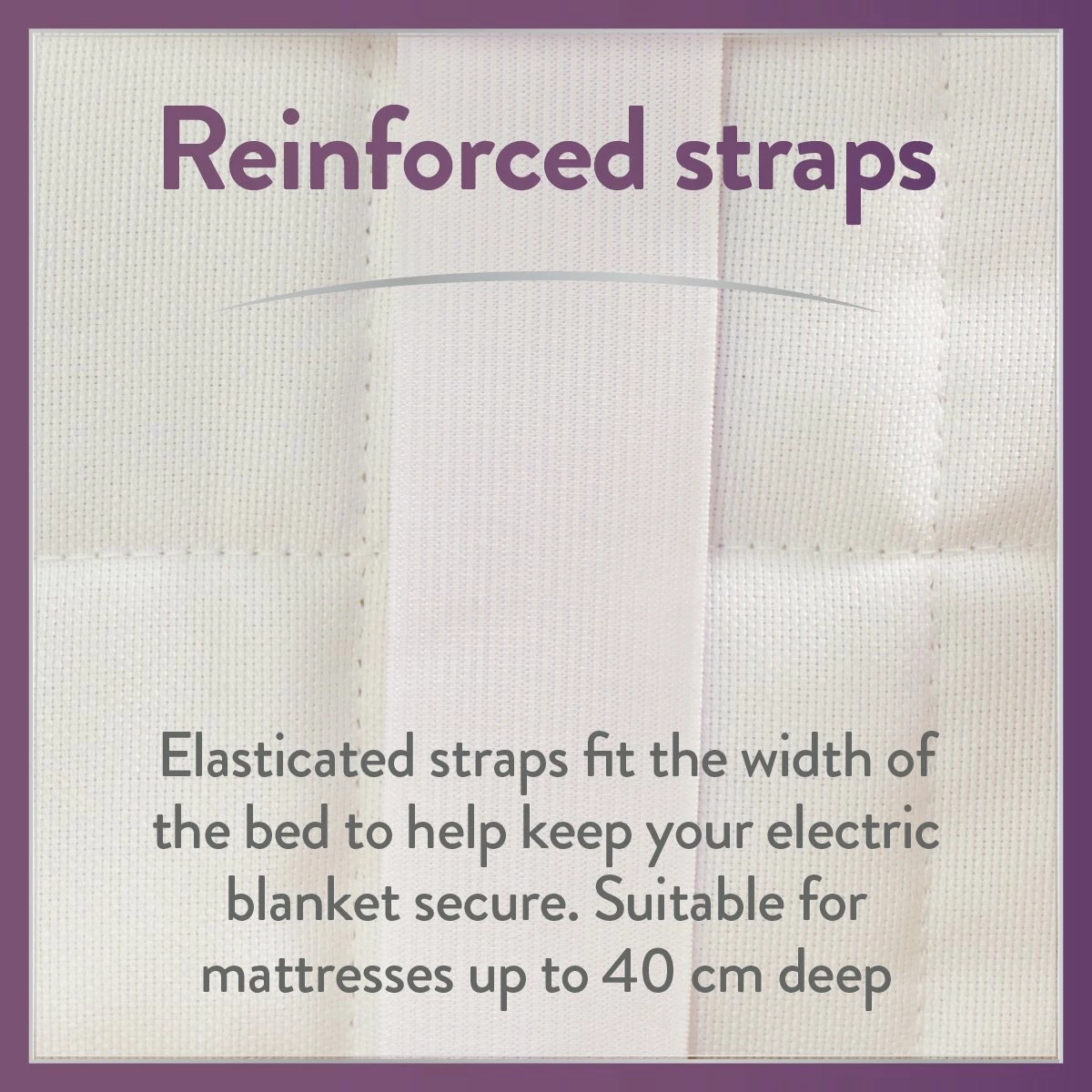 Quilted Comfort Layer, Single detachable control with 3 heat settings, 5 minutes heat-up time, Suitable for all night use, Low energy consumption 60Watt, Reinforced Elasticated Straps, 2 meter cable, Overheat Protection, BEAB Approved, 2 Year Guarantee, Machine Washable, 80x150cm – Single Bed.