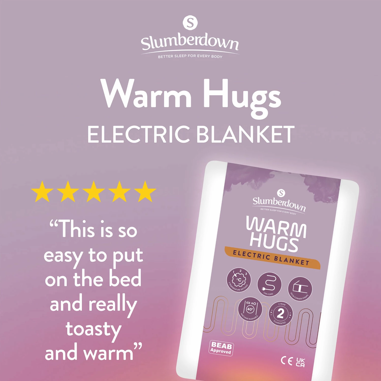 Keep yourself warm all night long with the Slumberdown Warm Hugs Electric Blanket. This soft touch electric blanket is easy to use. It comes with a host of benefits such as: full length reinforced elasticated straps. 3 x heat settings allowing you to achieve the perfect temperature. The controller is fully detachable, so it's machine washable. The blanket can be used all night long as it has a low energy consumption, with av, run costs of 1p per night. It also comes with a 2 year guarantee, giving you complete peace of mind.