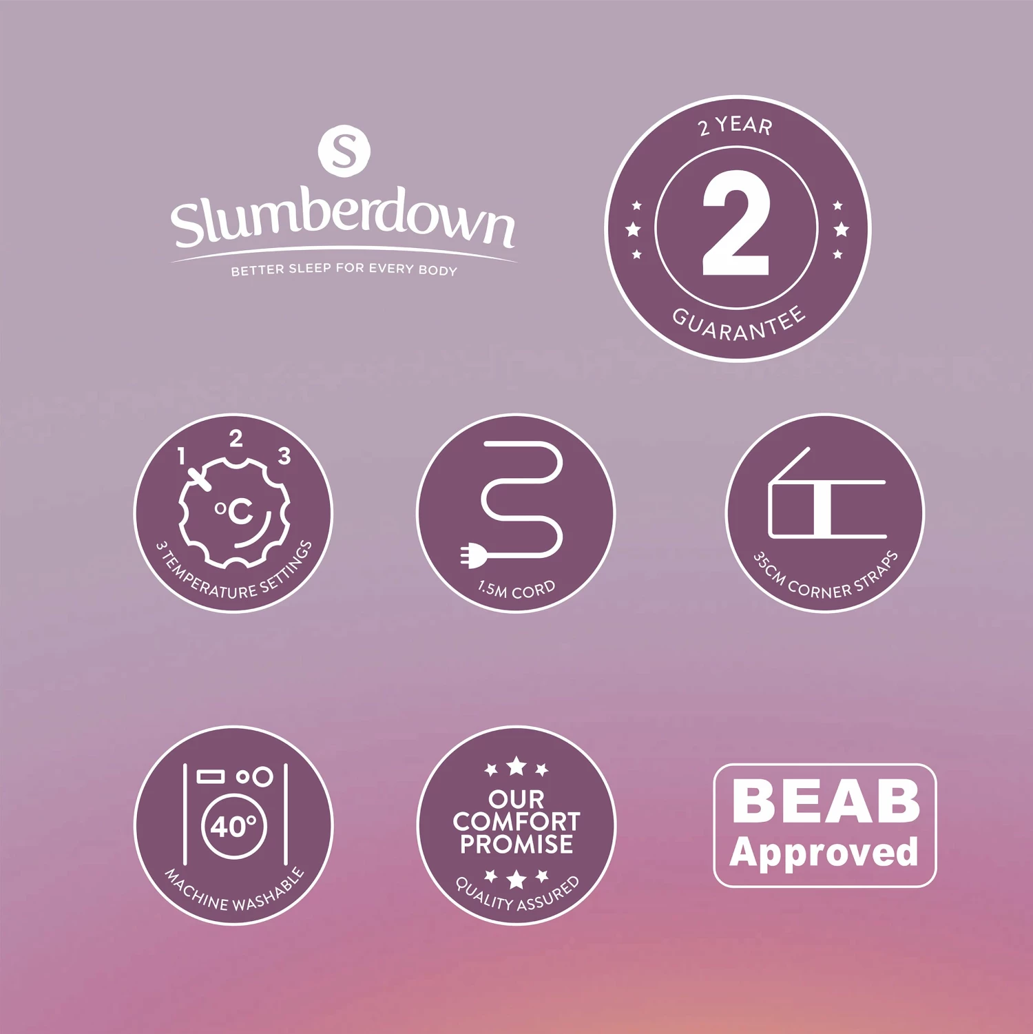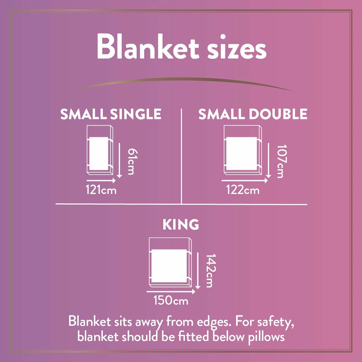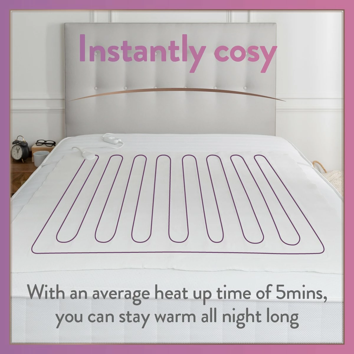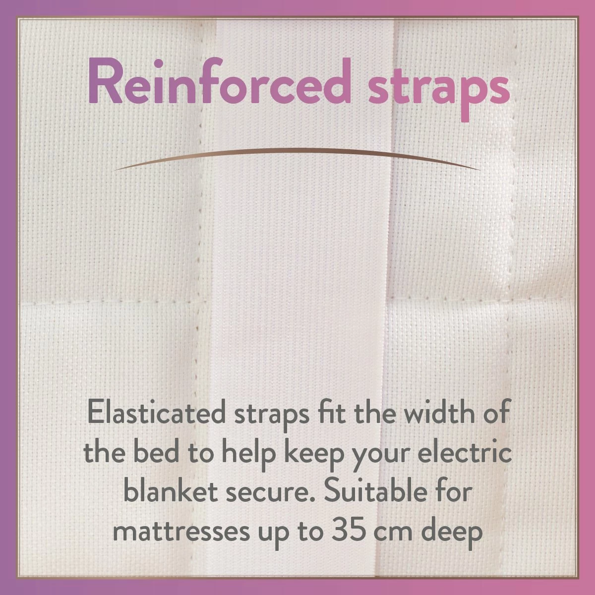 Single detachable control with 3 heat settings, 5 minutes heat-up time, Suitable for all night use, Low energy consumption 90Watt, Reinforced Elasticated Straps, 2Mtr Wire, Overheat Protection, BEAB Approved, 2 Year Guarantee, Machine Washable, 142x150cm – suitable for a King Size Bed.