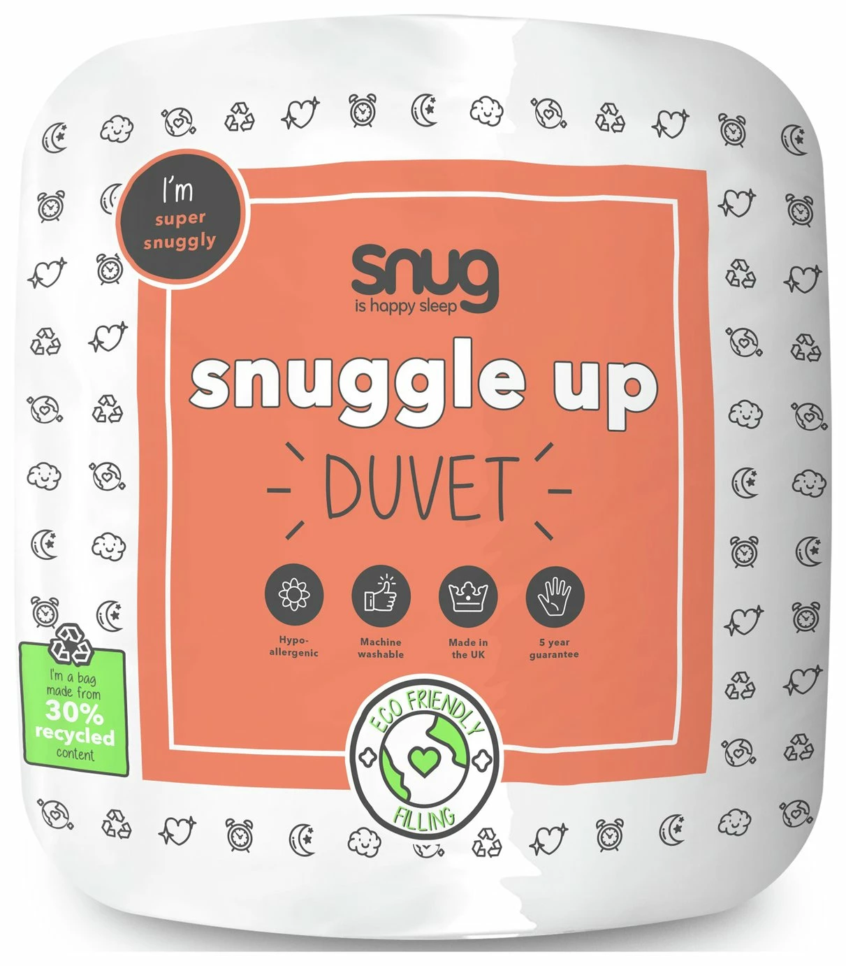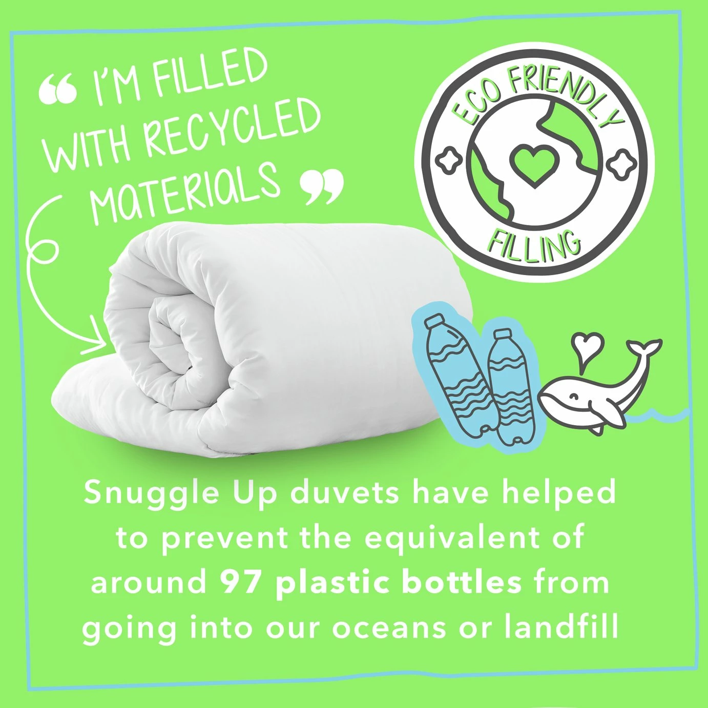 Cosy up and enjoy snoozy snuggles. The Snuggle Up duvet is made with soft covers and filled with oodles of squidgy fibres, keeping you super cosy all-night long, the perfect snuggle partner for chilly winter nights! The duvet is filled with recycled materials giving our lovely planet a helping hand. We care so you can be carefree, the squidgy fibres were once plastic bottles that have experienced a wonderful makeover. Our packaging is made from 30% recycled materials and can be fully recycled.
